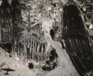 COLOGNE: Cologne, center of trade, traffic and political activity in the Rhine province, once had a population of close to one million people. It is the main railway center in the Rhineland and its numerous marshalling yards and rail branches have frequently been targets for this Group. In addition to its importance as a traffic center, Cologne was an extremely vital centre of industry, particularly of the engineering type. Ten raids were made on targets in Cologne and its environs and a total of 3 aircraft were lost by the Group. The famous glide bomb attack was made on this city.